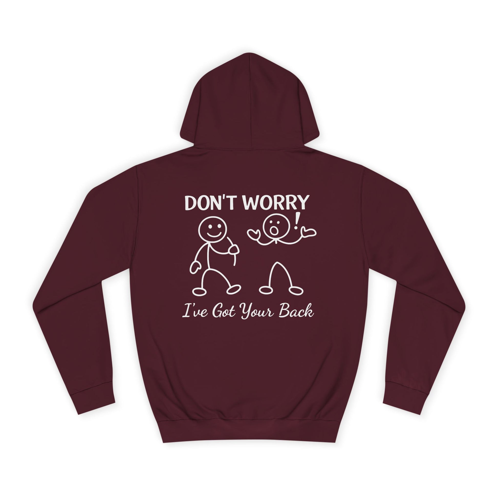 Stay cozy and stylish with this QA Hoodie, perfect for those laid-back days on campus or at home. The playful design featuring "DON'T WORRY, I've Got Your Back" adds a light-hearted vibe, making it a great conversation starter. This hoodie not only offers comfort but also brings a sense of joy and reassurance to your everyday wear. Ideal for students, friends, or anyone who values a good laugh and warmth in their attire. It's a wonderful gift for back-to-school celebrations, casual hangouts, or just because you want to make someone smile.